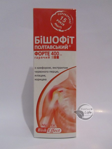 Бишофит Полтавский Форте 400 горячий для растирания в области спины и суставов с согревающим действием. Улучшает микроциркуляцию, тонизирует кожу, усиленно насыщает магнием и минералами. Прогревает, снимает усталость после физических нагрузок. Имеет важные магний-кальциевые эффекты в области суставов, связок и мышц.