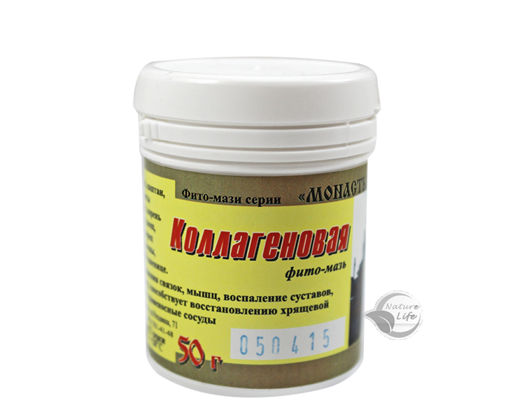 Фито-мазь "Коллагеновая" эффективно снимает скованность и боль в суставах и позвоночнике. Богатый комплекс аминокислот гидролизата коллагена и экстрактов лекарственных растений помогают восстановлению связок и хрящевой ткани, стимулируют кровообращение, возвращают эластичность сосудам, улучшают состояние кожи. Мазь после проникновения в кожу создает протеиновую сетку, составляющую основу для нового коллагена, производимого фибробластами. Эта сетка связывает воду и липофиловые субстанции.