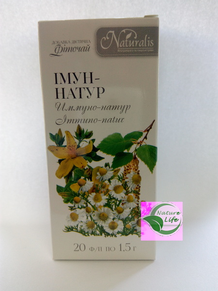 Фиточай Имун-натур способствует нормализации функционирования нервной, иммунной, сердечно-сосудистой системы и желудочно-кишечного тракта. Имеет мягкие мочегонные, желчегонные, потогонные и легкие знболюючи свойства.