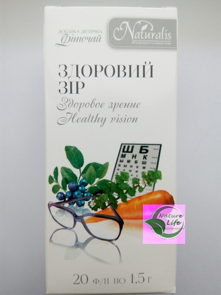 Фиточай Здоровое зрение - повышает остроту зрения, стимулирует обмен веществ, снимает спазм. Очанка укрепляет и "проясняет" глаза, черника ускоряет обновление сетчатки глаза. Репешок оказывает противовоспалительное, противоопухолевое действие. Плоды шиповника уменьшают ломкость кровеносных сосудов, корнеплоды моркови - незаменимый источник витамина А и бета каротина.