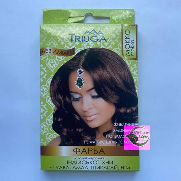 Краска для волос Мокко Triuga на основе натуральной индийской хны (без амиака) придает стойкий цвет волосам. Действует как натуральный кондиционер и оксидант. Благодаря добавлению индийских растений, таких как шикакай, ним, амла, гуава. Краска восстанавливает волосы, укрепляет и питает корни, усиливает структуру по всей длине. Приостанавливает процесс выпадения волос и стимулирует рост, устраняет перхоть. Придает объем и блеск.