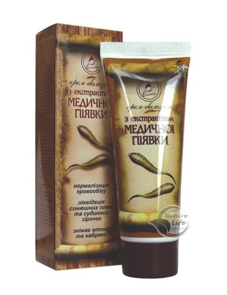 Крем-бальзам с экстрактом медицинской пиявки - способствует устранению синяков, кровоподтеков, сосудистых звездочек, а также снимает мышечное напряжение, усталость в ногах, уменьшает отеки, нормализует кровообращение при варикозном расширении вен.