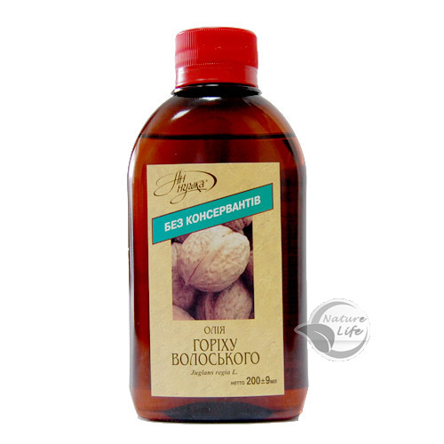 Масло ореха грецкого, полученное путем низкотемпературной технологии. Гамма - линоленовой кислоты не менее 1,5%. Содержит витамины А, Е, полиненасыщенные жирные кислоты пальмитиновую, стеариновую, олеиновую, линолевую, линоленовую и другие; вспомогательные ингредиенты – кукурузное масло. Продукт не содержит ГМО. Не содержит консервантов.