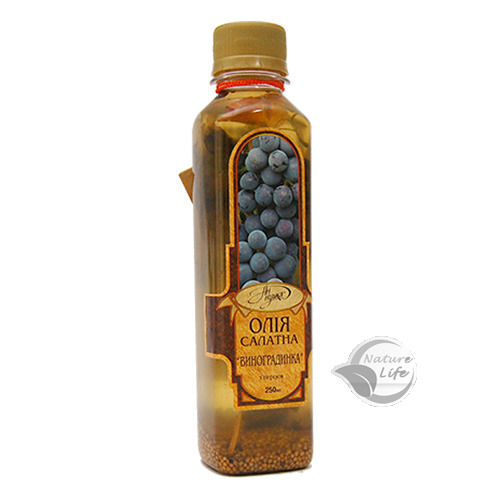 Салатное масло "Виноградинка", изготовлено из виноградных косточек, богато полиненасыщенными жирными кислотами класса омега 3, витаминами Е, А.