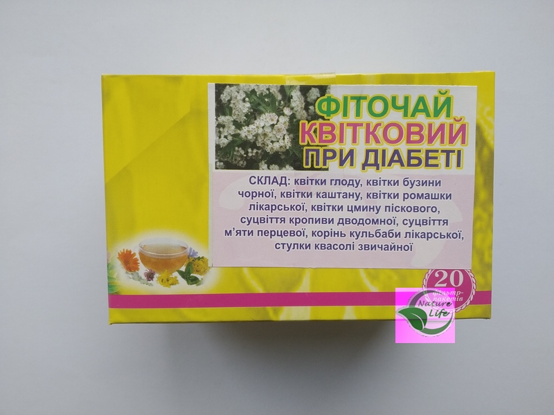Фиточай Цветочный при диабете (в пакетиках) изготовлен из растений собранных в экологически чистых районах Украины. Фиточай в состав которого входят 9 лечебных трав, это продукт комплексного действия, который одновременно способствует снижению уровня глюкозы в крови, востонавливает обмен веществ, способствует улучшению функций пищеварительной системы, является полисорбентом-детоксикантом, иммунокорректором и антиоксидантом.