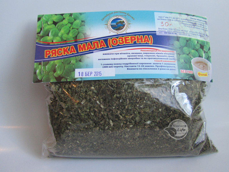 Способ применения: 1 ст.ложку ряски залить 1 стаканом (200мл.) кипятка. Настоять 15-20 минут. Профильтровать. Употреблять по полстакана 3 раза в день.