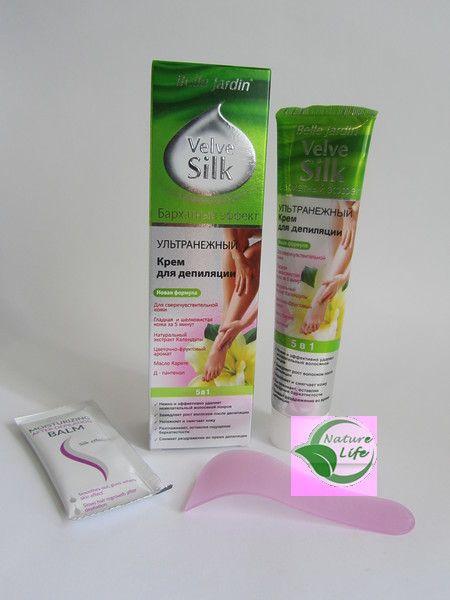 В состав набора входит крем, удобный шпатель и пакетик увлажняющего бальзама после депиляции.