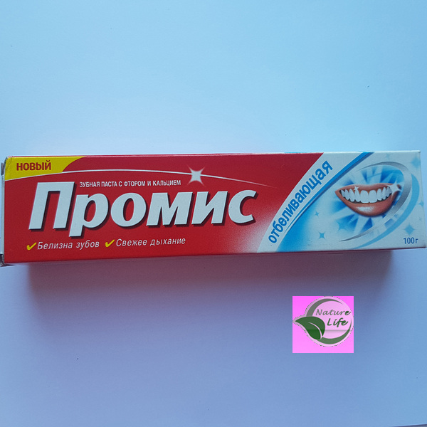 Зубная паста Промис отбеливающая 100г DABUR - сожержит усиленную формулу с фтором и кальцием для интенсивного укрепление зубной эмали. Комплекс целебных индийских трав и классических отваров помагает улучшить кровообращение в деснах, уменьшить их чувствительность и снять воспалительный процесс. Активные компоненты пасты способствуют заживлению мягких тканей, а специальные антисептические ингредиенты уничтожают все вредные микробы, попадающие на поверхность зубов и в межзубные промежутки.